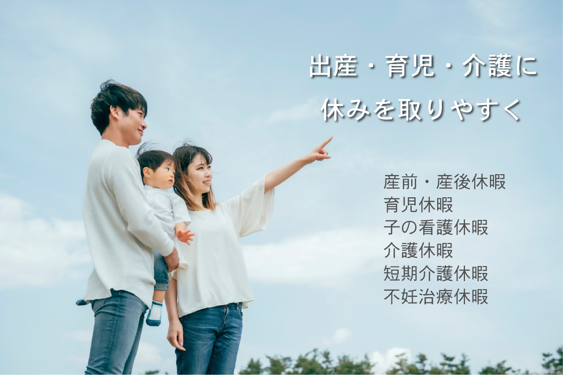出産や介護によってライフステージに変化が訪れても自分らしい日々を過ごすことができるよう、両立支援に取り組んでいます。